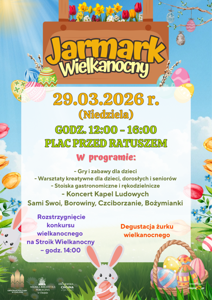 W niedzielę 29 marca 2026 roku na placu przed Ratuszem w Chojnie odbędzie się Jarmark Wielkanocny. Wydarzenie zaplanowano w godzinach od 12:00 do 16:00. Organizatorzy przewidzieli udostępnienie przestrzeni dla wystawców oferujących rękodzieło, dekoracje świąteczne oraz produkty spożywcze charakterystyczne dla regionu. Impreza ma charakter otwarty i jest skierowana do mieszkańców miasta oraz przyjezdnych gości poszukujących tradycyjnych wyrobów wielkanocnych.